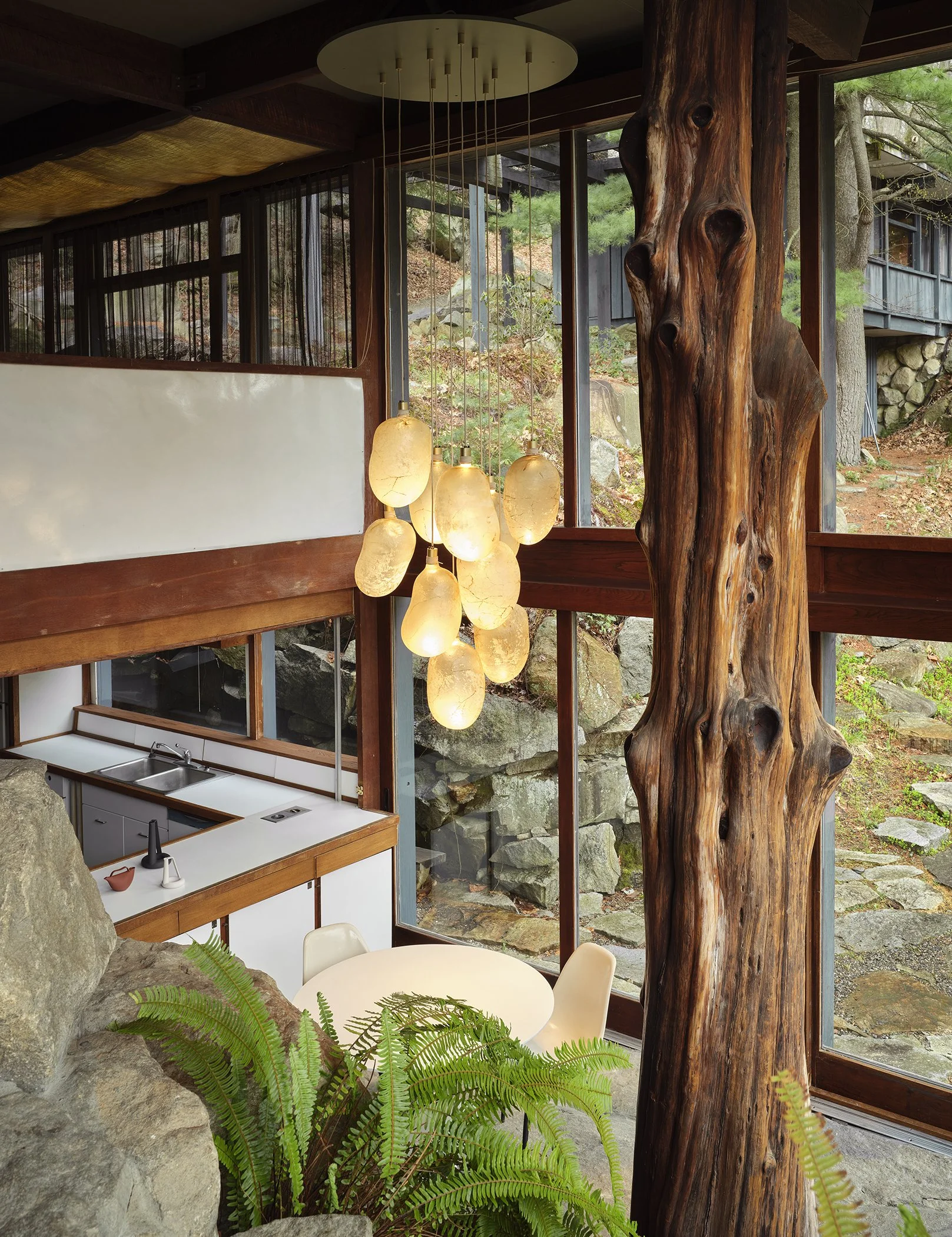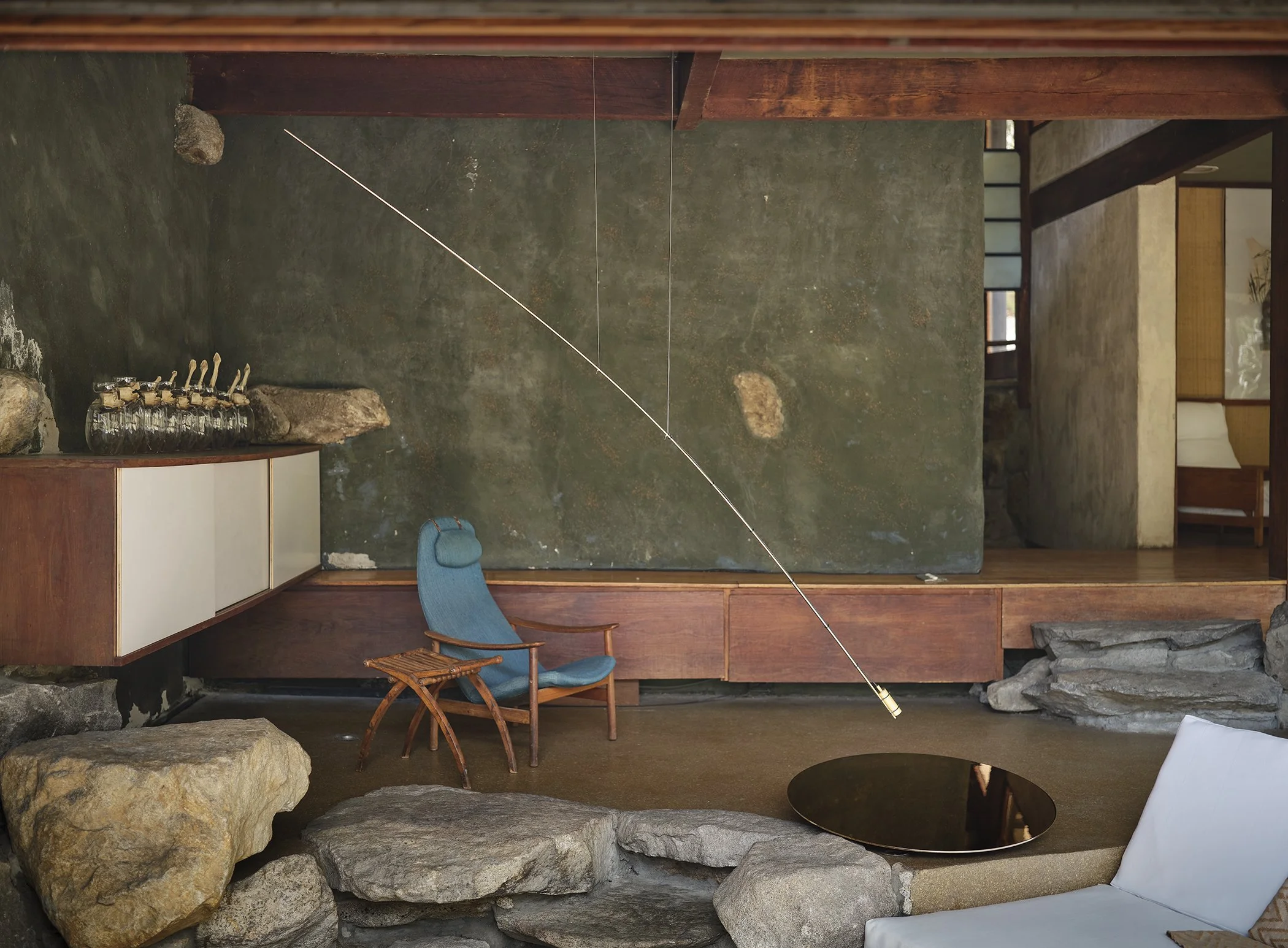 Across the open landing where a tree trunk spans from the floor to the double height ceilings, a series of delicately hung amorphous blobs illuminate the dining room table below. With a unique veining running through each, they nearly resemble sun-kissed stones. It turns out they are cow bladders from the same cows used for crafting the glass jugs. For Wright, who firmly believed that the dining table is the nucleus of the home, it seems fitting that the exhibition’s showstopper highlights just that.