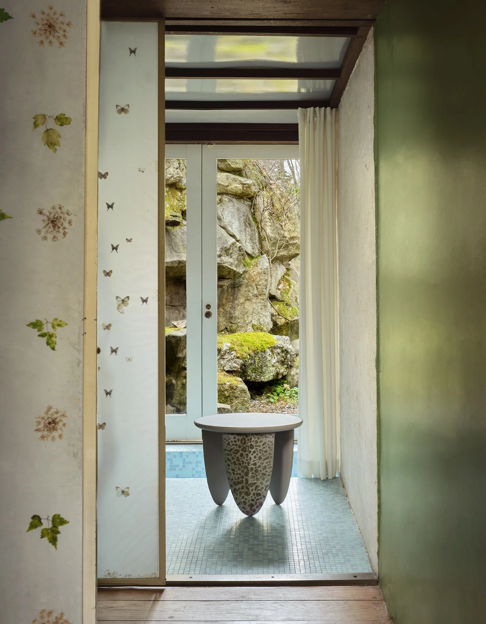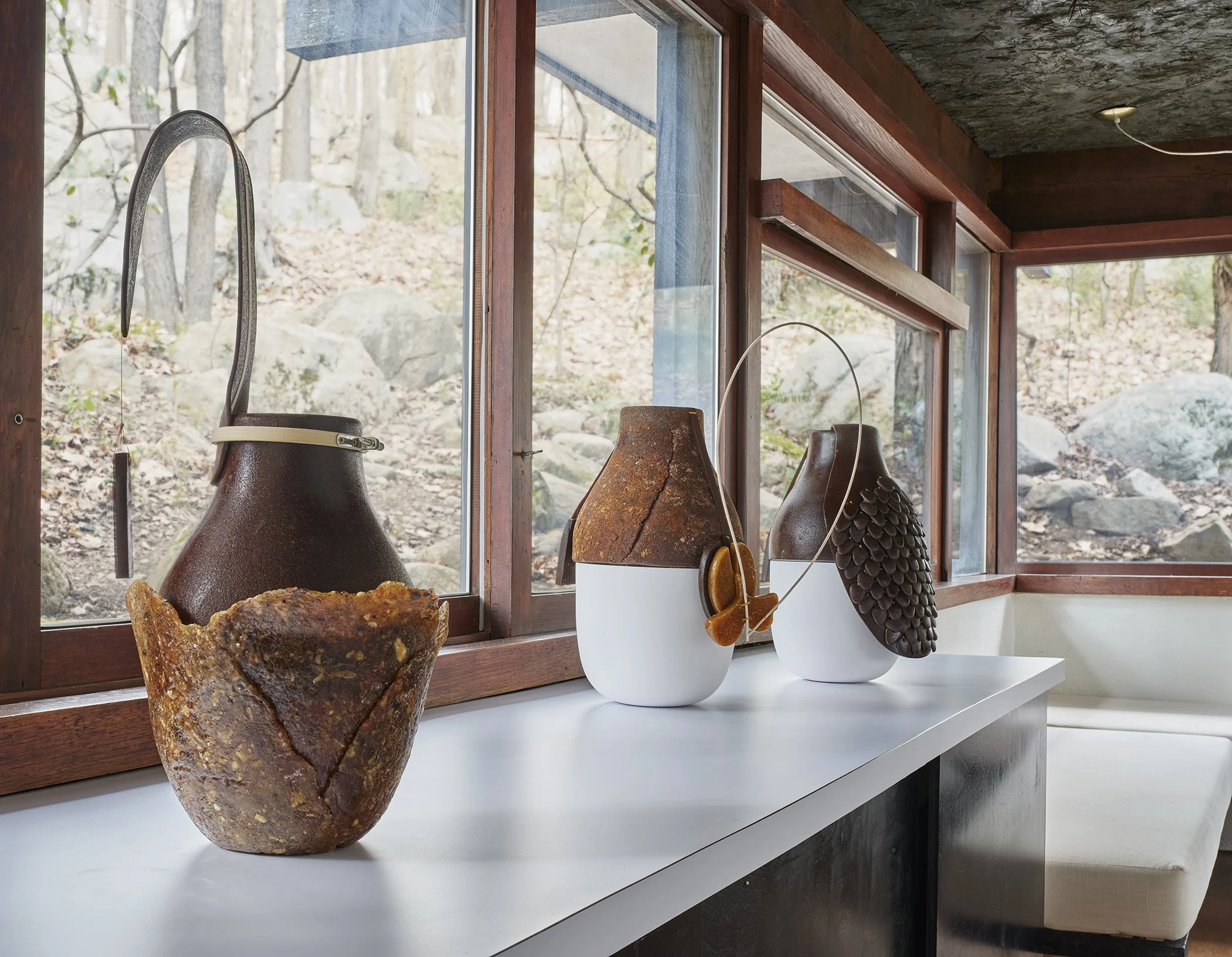 In order to embark on the project, Trimarchi and Farresin visited the landscape and studied the home seamlessly perched on the ledge of a lake. Referred to as the “Dragon Rock,” the structure is an homage to the surrounding land: steps are made from the same rocks it sits on; ceilings are embedded with pine needles taken from the trees; and doorknobs are crafted in various stones sourced near the water. Despite the seemingly endless array of intricate details, there’s a striking simplicity to this home imbued with Wright’s quaker-born sensibilities. Formafantasma’s selected works, primarily from their earlier series, take a contemporary, naturalistic approach akin to Wright’s interior. The exhibition, Designing Nature, done in collaboration with Cold Spring-based museum and research center, Magazzino, spans the two structures on the property: Wright’s studio, and the family home.
