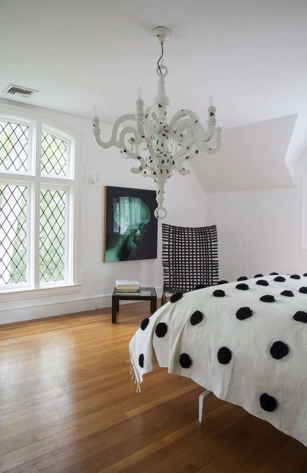 Milana chair, 1994, by Jean Nouvel for Sawaya & Moroni; Graphic Design Papier Mache Chandelier, 2007, by Studio Job; Moroccan cotton and wool pom-pom bedspread.